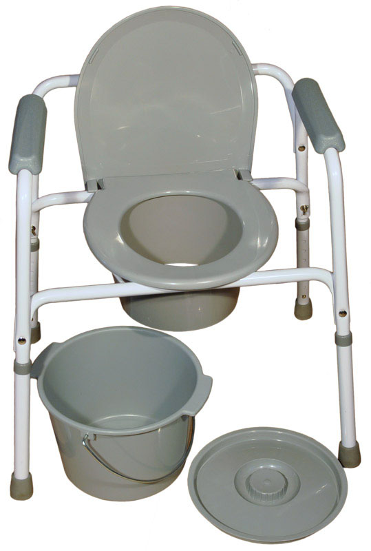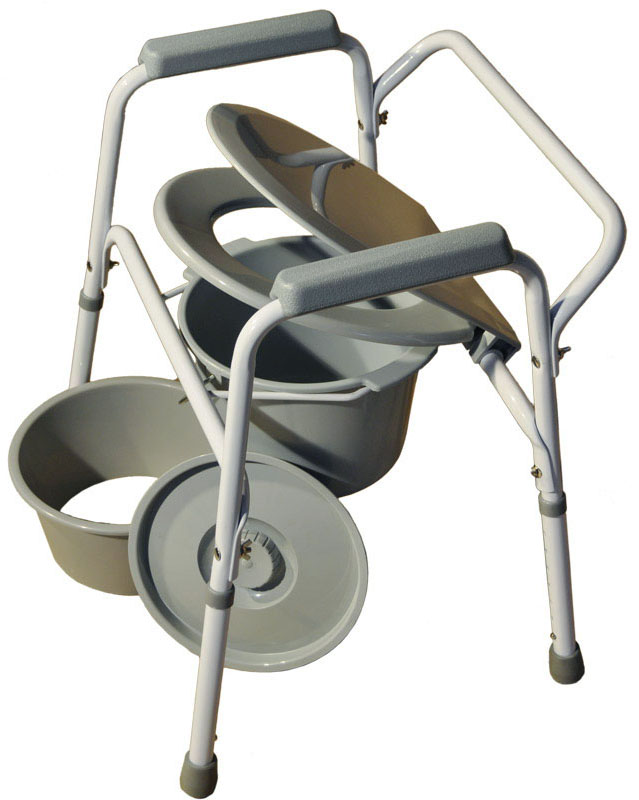 Nelijalkainen teräksestä valmistettu wc-koroke jaloilla, käsinojilla ja selkätuella. Selkätuen myötä soveltuu myös WC-huonetuoliksi. Tukeva rakenne. Mukana ämpäri kantolenkillä, kannella ja roiskesuojalla. Runko purettavissa siipimuttereilla ilman työkaluja osiin.
